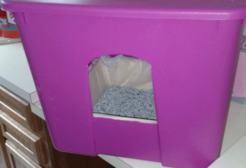 I had to reply to this. The genius here is not the homemade box or the fact that it is enclosed, though those are clever ideas. My take away is something you did not even mention and is barely visible, but that is where the palm hits the forehead for me. A BAG IN THE LITTER BOX. Why have I been tormenting myself all these years. I am ashamed to admit I never thought of that.
