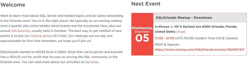 You’ll notice no sponsor logo or sponsor tab above. I like sponsors, but I’m not interested in loading/changing logos every month or even every quarter and I’m not sure showing the logos there provides much value at all to members or sponsors. Maybe we’ll do something on an annual basis, or combine it with SQLSaturday sponsorship, or just not worry about it at all. Sponsors will be per event and get to talk to the attendees there (or we will on their behalf) and I think that’s where the value is.