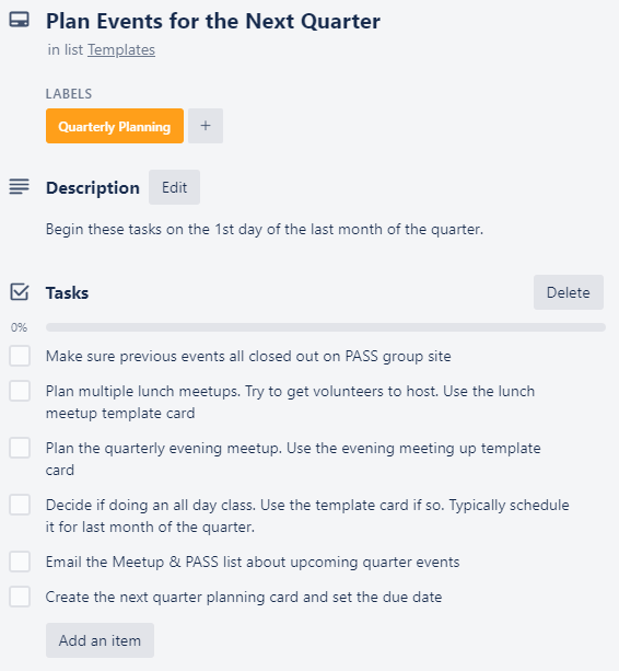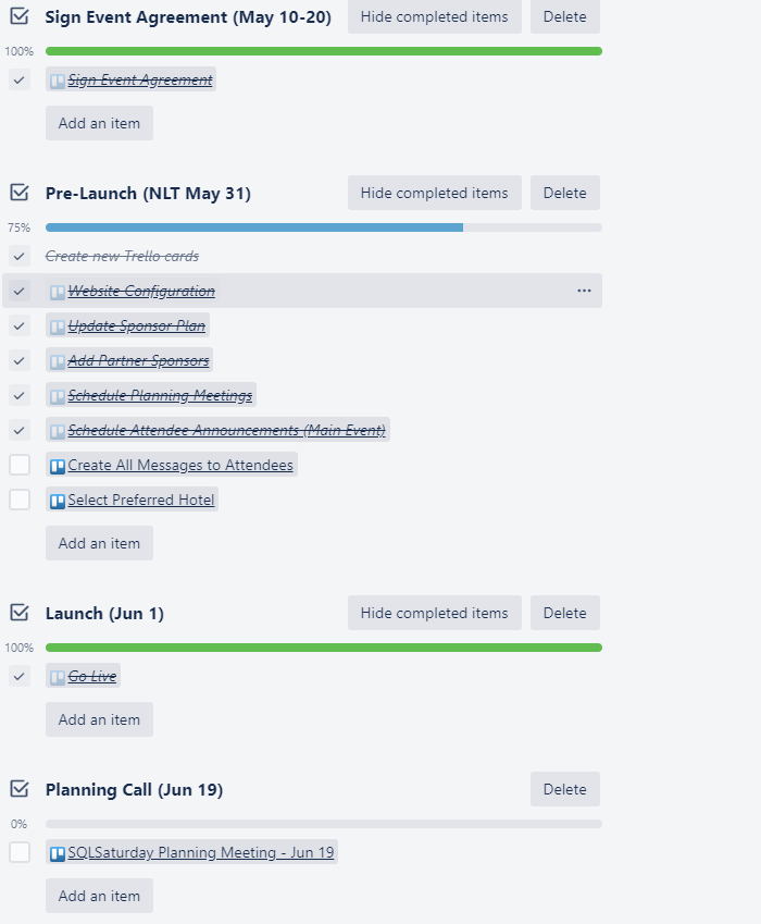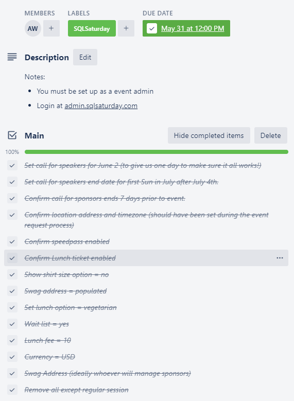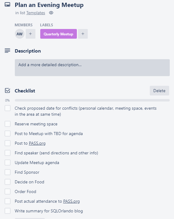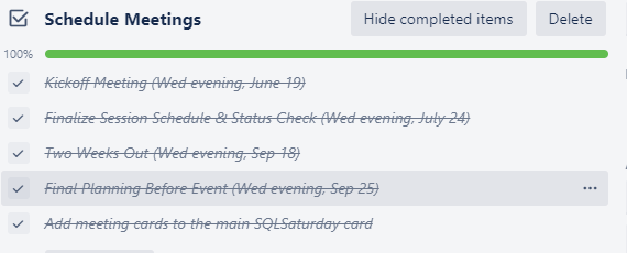 For SQLSaturday I hoped to do one template card as well, but it’s hard to manage. You can link cards to the checklist items, that works ok. But if you add new cards you’d have to manually add them to the parent card. For a single event that’s fine, it’s only when you think about how to copy them all over and reset for the next year that it matters a little (copy over minus comments, clear the checkboxes, maybe other stuff?). I’ll worry about that later! Maybe the biggest win out of just typing away on this starter/parent card was thinking about how to break the work down into deliberate blocks.