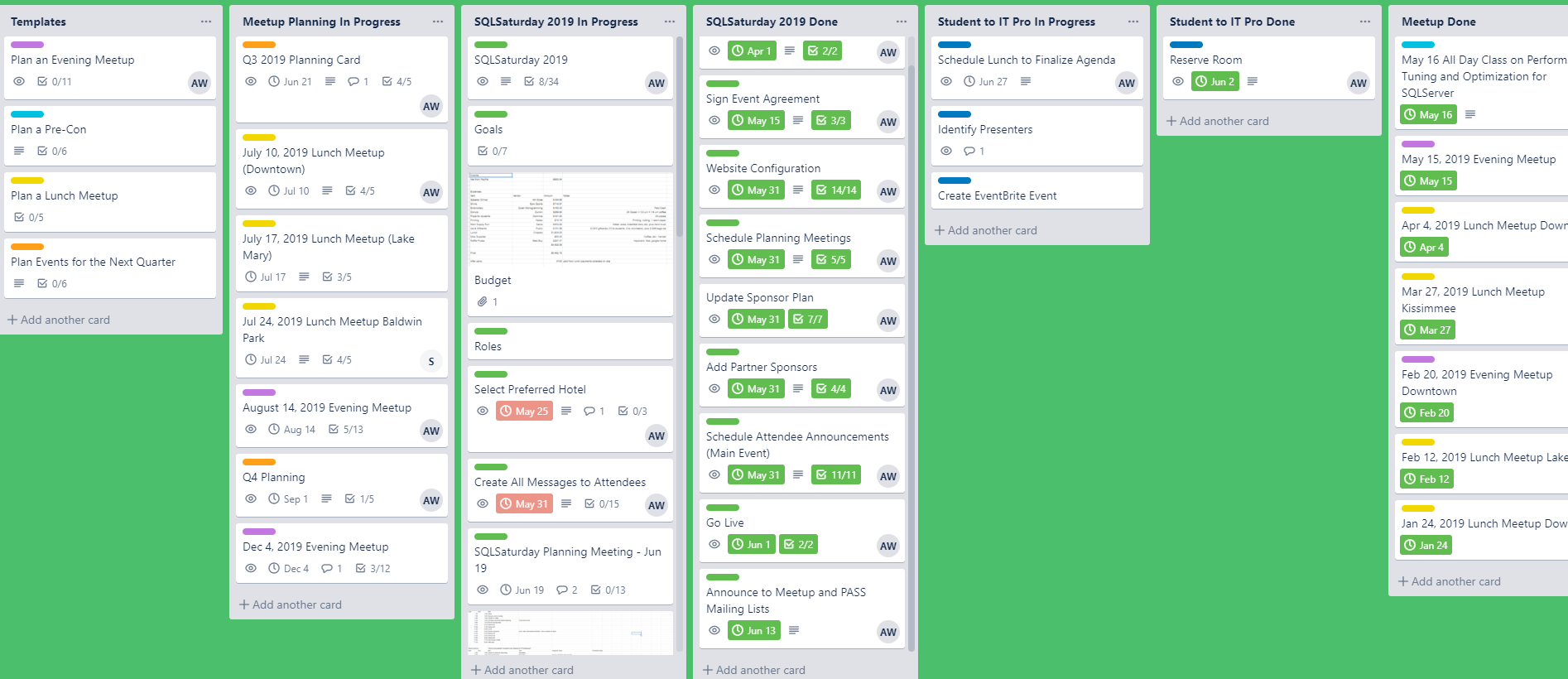I’m trying Trello this year to manage both SQLSaturday and our other events. Part of that is giving the whole team visibility of the work that remains to be done, part is having artifacts that are reusable (if not perfectly) year over year, and part is just having a system better than what we have now (notes + spreadsheet + tribal knowledge).