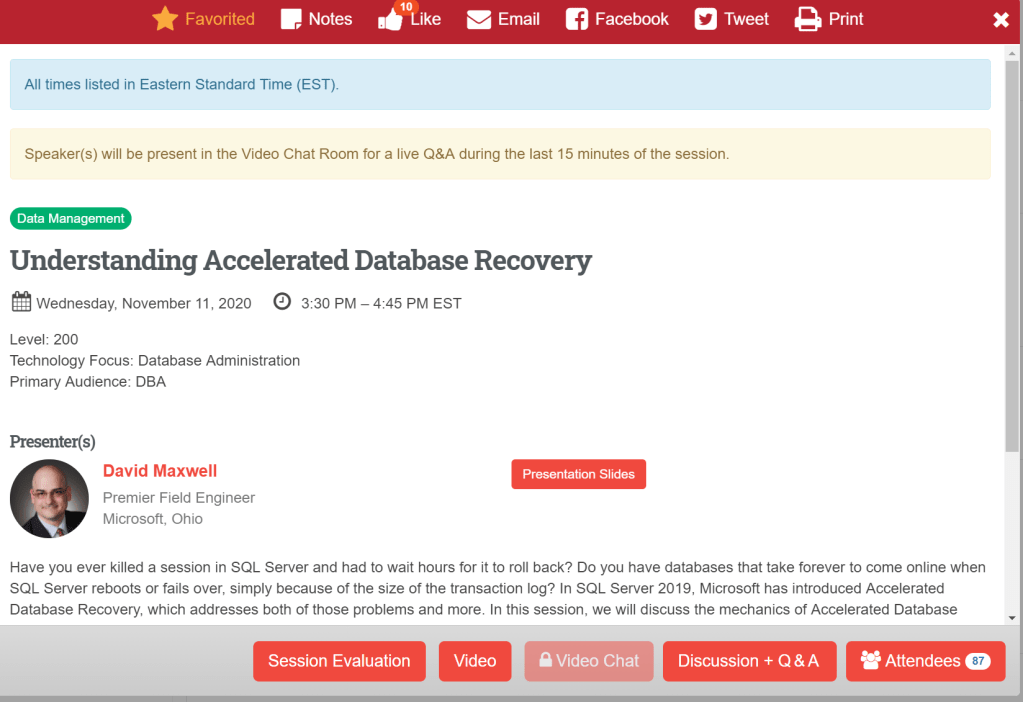 The question tab for the presentation tab is just ok. I saw at least one session where the answer was “answered”, presumably sometime during the presentation. That’s not very helpful to attendees (and moderators can mark questions as answered to help sort through the list). Better would be a quick sentence of two to summarize the answer, really superb might be that and/or a time mark in the presentation (go to 2 mins 15 to see more on the answer to this question, that kind of thing). I haven’t gone back to look, but for sessions that were pre-recorded in particular I wonder if the final recording will somehow contain the questions?