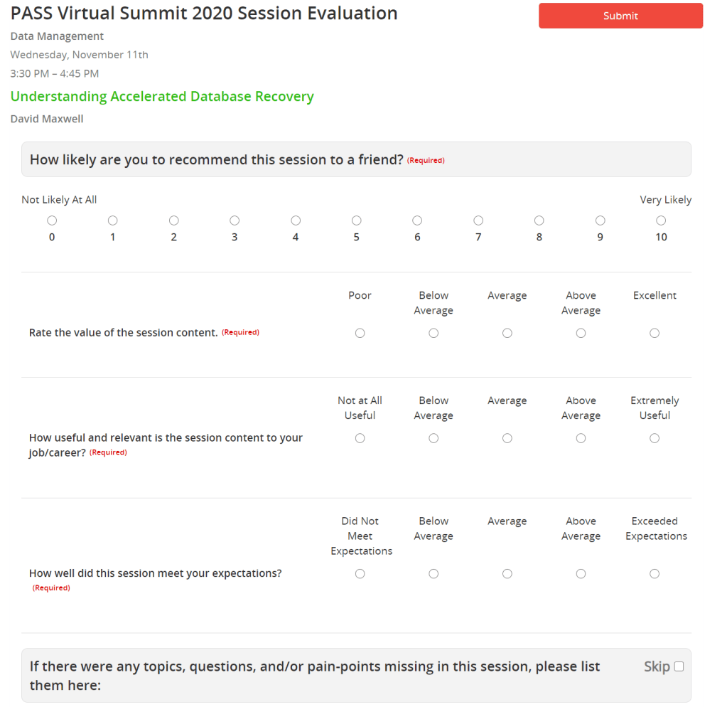 There’s a session evaluation button on each “room”, and that’s good, but I consistently forget to do it while I’m there and then have to go back and fill them out later (which means I do fewer). Some samples below, the eval screenshot is about 50% of the total questions you can answer.