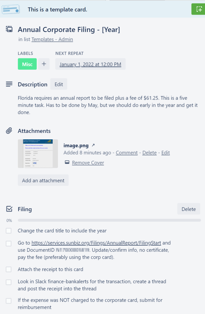 As a Florida corporation we have to file an annual report. Sounds complicated, but for us it’s a five minute task. Here’s the Trello card for the work I just did: