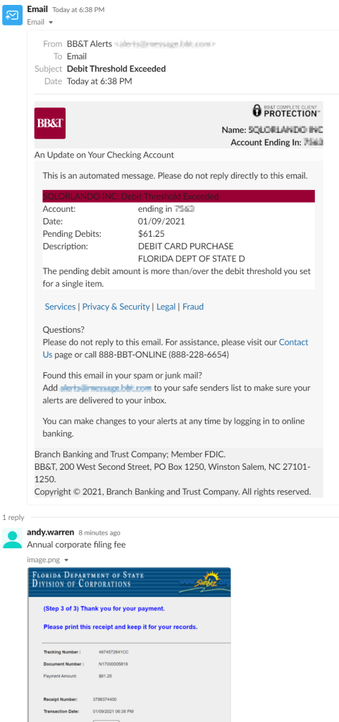It’s still less than perfect (no details on how you would submit for reimbursement for example) but I think it fairly describes the work we need to do. The main change from the previous version of the card is the slack channel task. We have all bank transactions posting to a channel that all the Board members have access to, so they’ll see this: